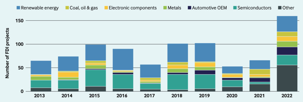 Number of foreign investment projects worth at least USD 1 billion, by sector in 2013-2022