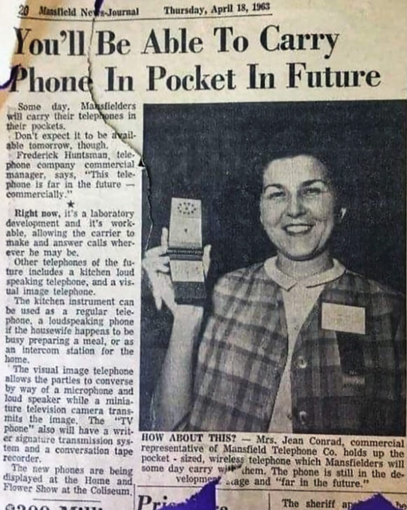 Pewnego dnia pracownicy firmy Mansfield Telephone Co. będą nosić telefony w kieszeniach. Nie oczekuj jednak, że stanie się to już jutro. Frederic Huntsman – dyrektor handlowy tej firmy telefonicznej, mówi: „Komercyjnie, ten telefon jest jeszcze w odległej przyszłości”.