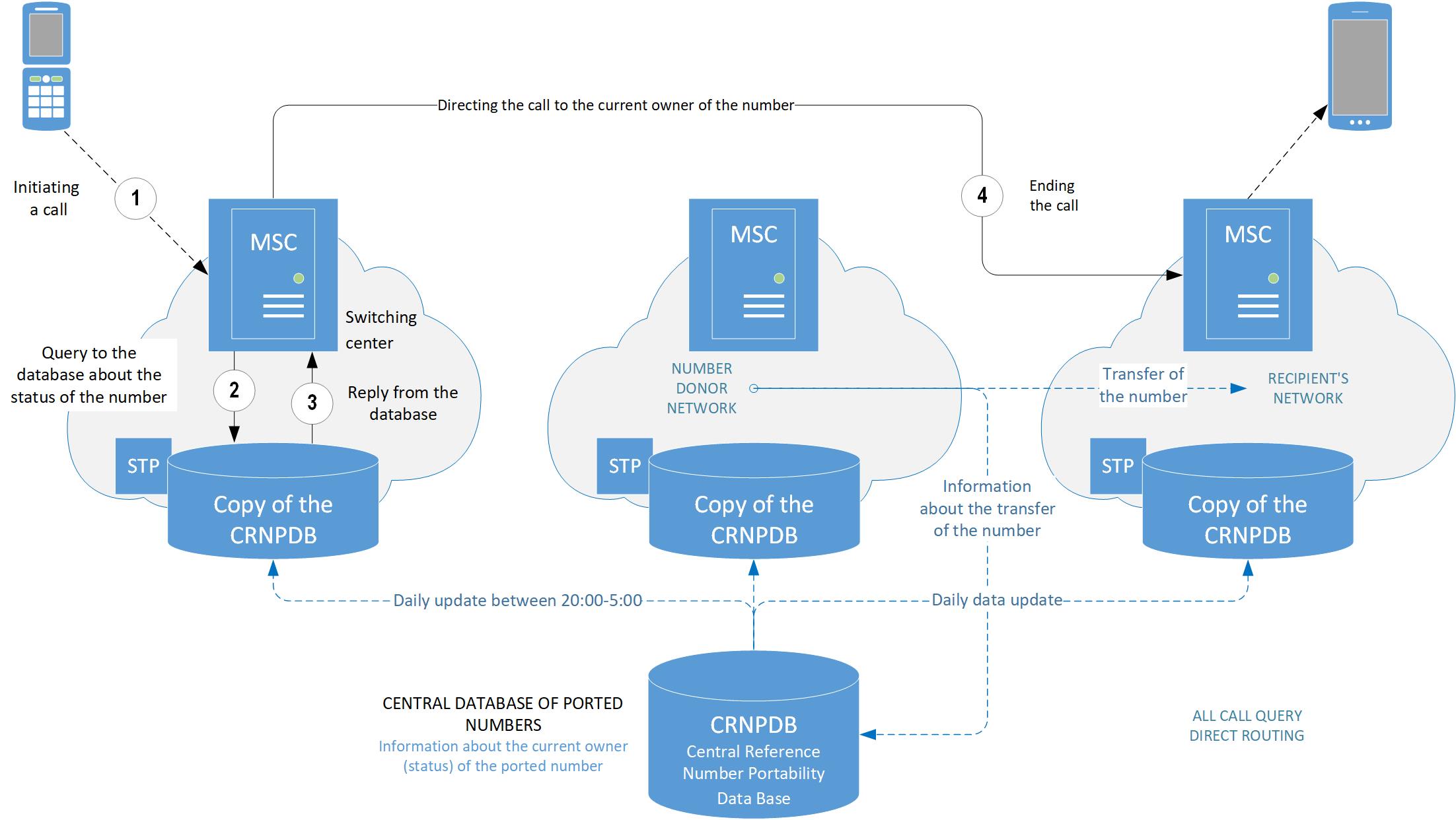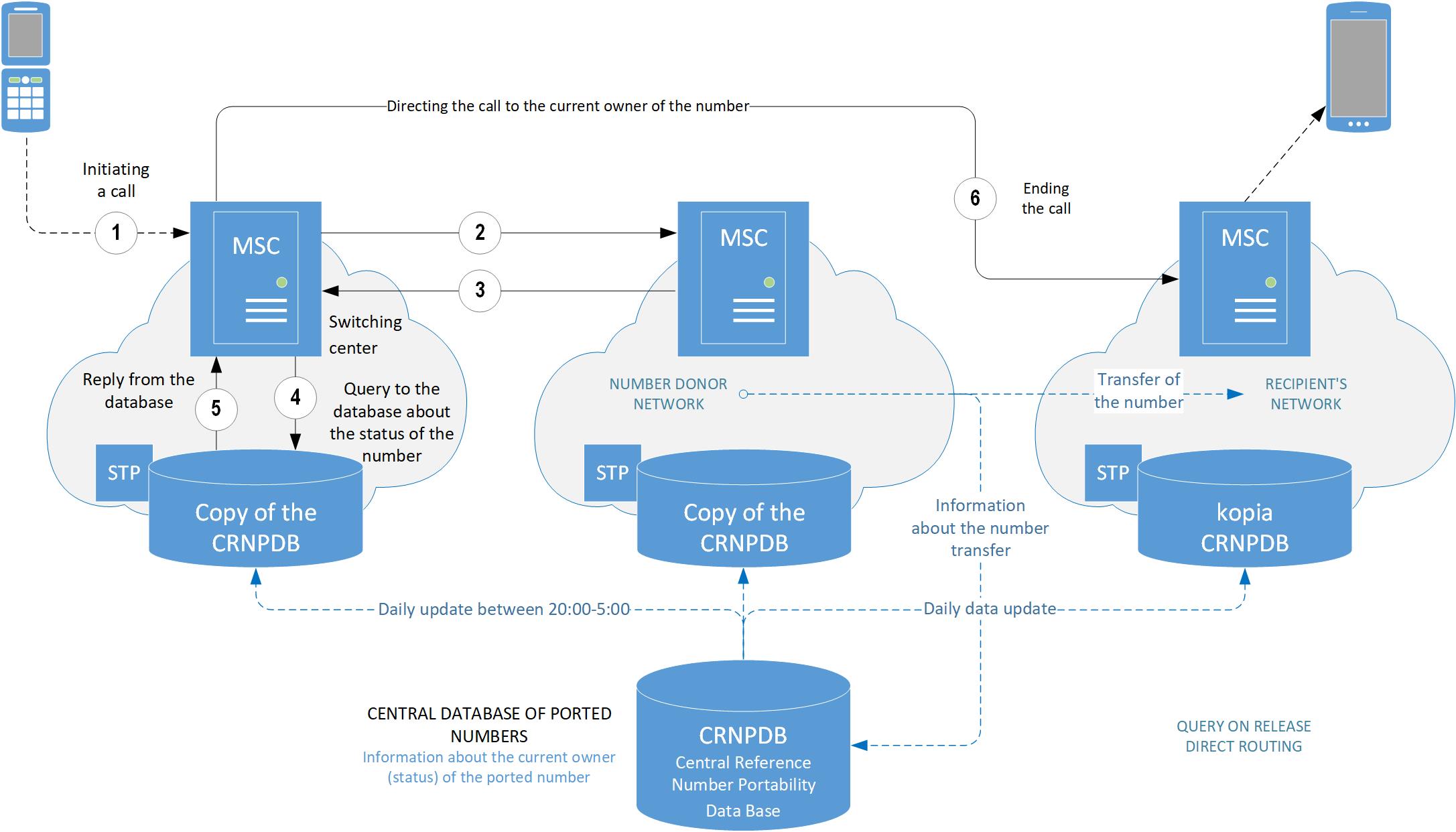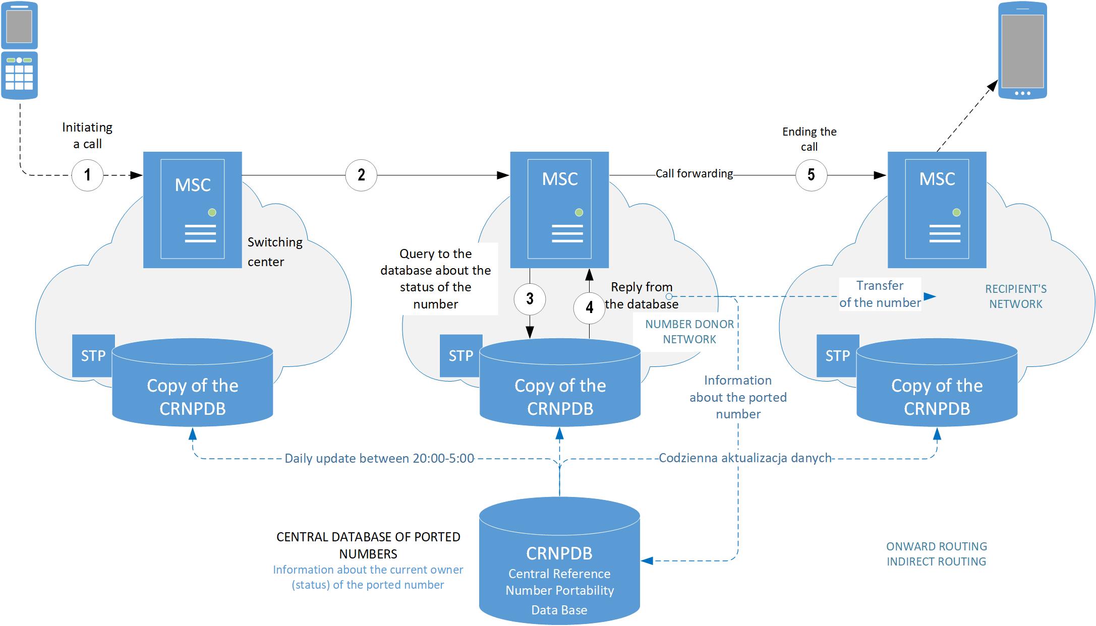 The OR (Onward Routing) method redirects the call through the network that transferred the telephone number to another operator. The call is initiated in a classic way and directed to another one based on the programmed information about the assigned numbering ranges. If the network receiving the call termination request finds that the called number has been ported, it queries the database of ported numbers and then establishes (redirects) the call to the appropriate operator. The donor’s network becomes part of the established connection for the entire duration.