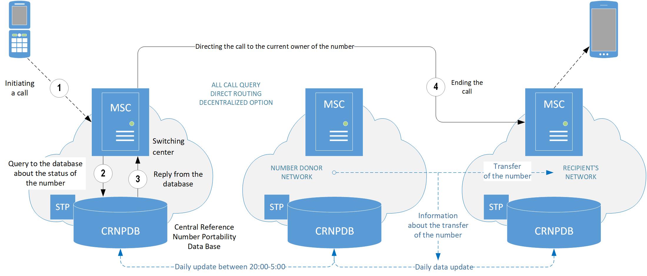 The ACQ (All Call Query) method allows you to direct calls directly to the network operator (direct routing), which has a telephone number transferred to it. Each connection is established after polling the database of transferred numbers, from which the exchange initiating the connection receives information about the operator or the exchange managing the called number. The ACQ method requires the existence of a Central Reference Number Portability Data Base, which can be managed jointly by operators, or by an independent economic entity, or by a state organizational unit. The resources of the central database are replicated by individual operators and updated once a day.