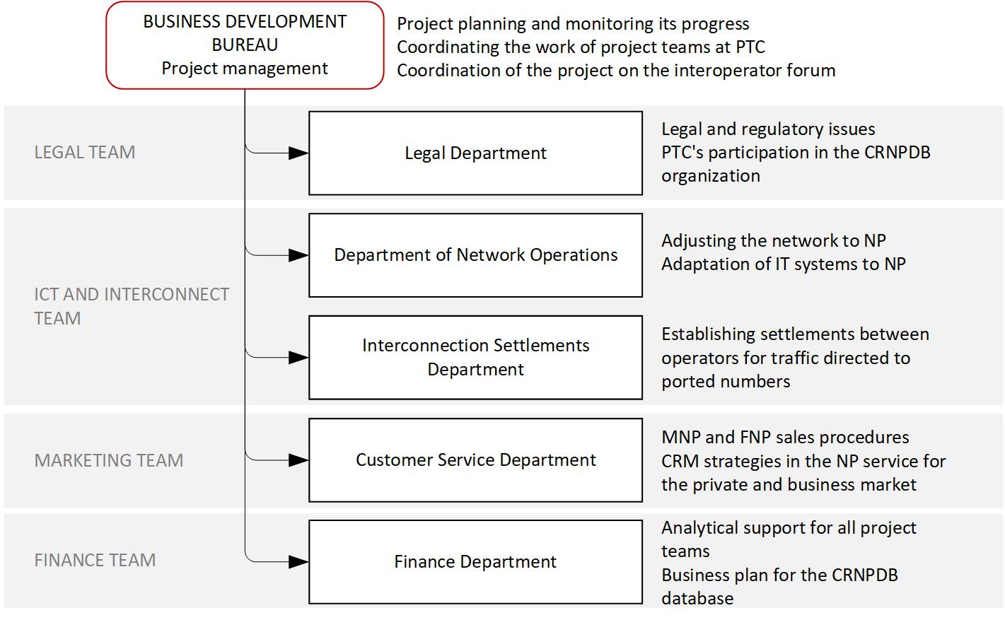 The implementation of the MNP and FNP services required many changes to ICT systems, establishing and implementing customer service procedures, agreeing on the method of directing telecommunications traffic to ported numbers (with or without a central base), as well as analyzing the security of systems, updating the principles of interconnect settlements and concluding new contracts about cooperation. Coordination of numerous project issues, located in distant fields, required an interdisciplinary approach to planning and coordinating project tasks.