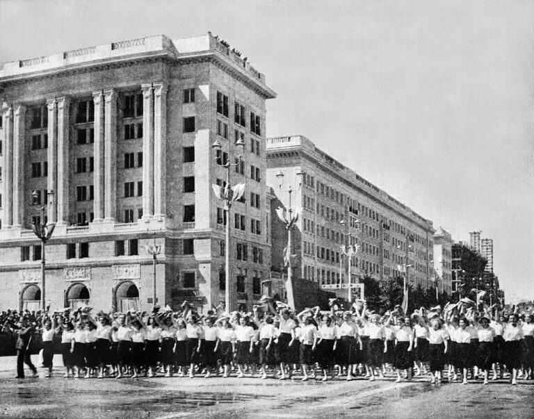 [26] In the Polish People’s Republic (PRL), urban planning in many cities was modeled on Soviet urban concepts, based on socialist realism and centrally planned economy principles.** This approach was characterized by monumental architecture, wide transportation arteries, distinct functional zoning, and residential districts designed as “microdistricts” (self-sufficient units with access to basic services). Post-war reconstruction and urban development in Poland were driven by ideological goals of industrialization, collectivization, and the removal of traces of the bourgeois past. Examples of Soviet influence on urban planning in Poland include: (1) The Marszałkowska Residential District (MDM) in Warsaw, designed after Moscow; (2) Nowa Huta—a model socialist city built from scratch; (3) In cities like Gdańsk, Wrocław, and Poznań, modernist and socialist-realist solutions replaced historic urban fabric with simple, functional housing blocks. After 1956, as socialist realism was abandoned, Polish urban planning gradually moved away from Soviet models.