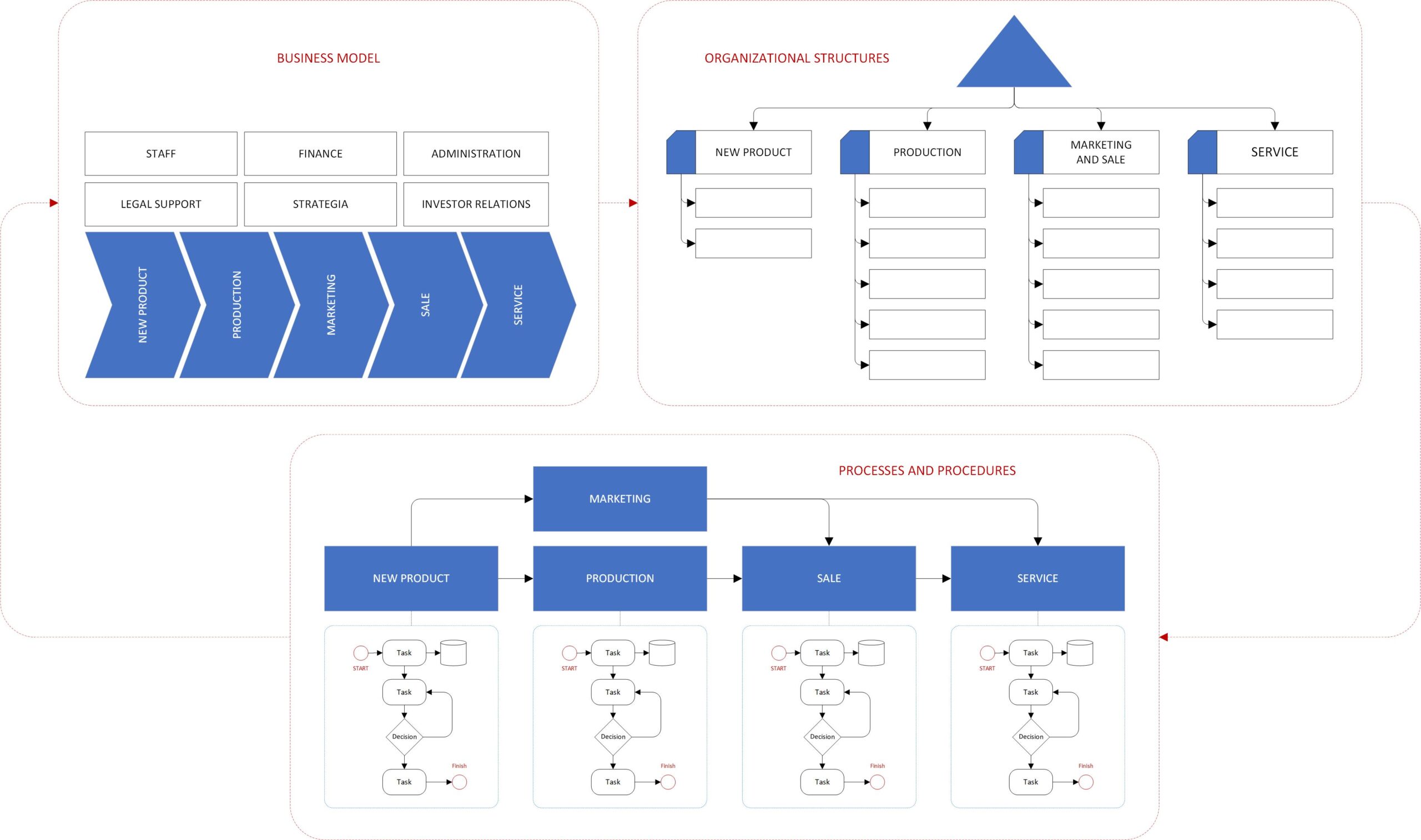 A business model is a way (sequence of activities) characteristic for a given industry, in which a company creates value for a customer (product, service). Organizational structures are characterized by two basic parameters – the maximum span of control and the maximum command chain. Business processes are composed of procedures, and larger ones can be divided into sub-processes.