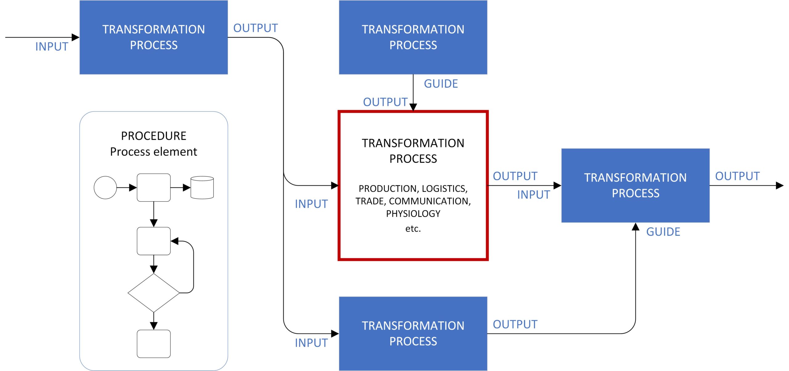 A business process is a set of interrelated activities (procedures) aimed at creating a value for the customer. The course of the process is determined by four basic values: INPUT – input value, OUTPUT – output value, GUIDE – a value describing the course of the process and ENEBLER – worker (people and technologies), performing a specific type of transformation (convertion) of the input value (resource) into the output value (product). Business processes, also known as transformation processes or work processes, can perform various types of transformations: physical (production), locational (logistics), exchange (trade), physiological (medicine), informational (IT) and many others.