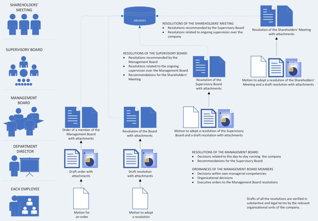 The description of the procedures has been prepared in text and graphic form. The text was developed in accordance with the principles of legislative technique, while the graphic part presented procedural paths in the form of flow diagrams. A separate place is devoted to the description of the principles of archiving documents related to the activities of the company’s bodies. An integral part of the description of the rules of conduct was also a set of 18 appendices, setting out templates for applications, notifications, meeting agendas, presentations, orders, resolutions and minutes.
