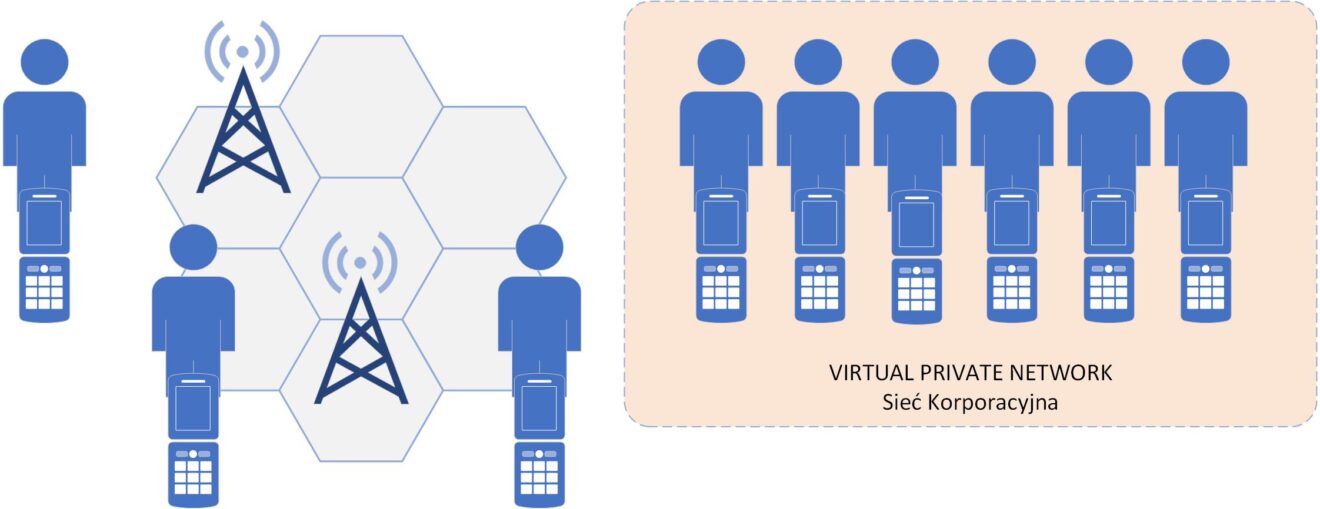 Przykładem tego typu rozwiązania jest oferowana w sieci Era usługa pod nazwą Sieć Korporacyjna. Wdrożenie tej usługi pozwala na zachowanie pełnej kontroli nad wydatkami telekomunikacyjnymi grupy oraz usprawnienie jej wewnętrznej komunikacji. Możliwe jest profilowanie zakresu uprawnień́ poszczególnych użytkowników telefonów (np. blokowanie połączeń́ poza grupę̨, do innych sieci lub na wybrane numery), a także korzystanie ze skróconych numerów. Korzystanie z tej usługi nie wymaga wymiany karty SIM ani dokonywania żadnych zmian w uprzednio użytkowanych telefonach. Abonent Sieci Korporacyjnej może też swobodnie korzystać́ ze wszystkich usług dodanych, dostępnych w ofercie operatora.
