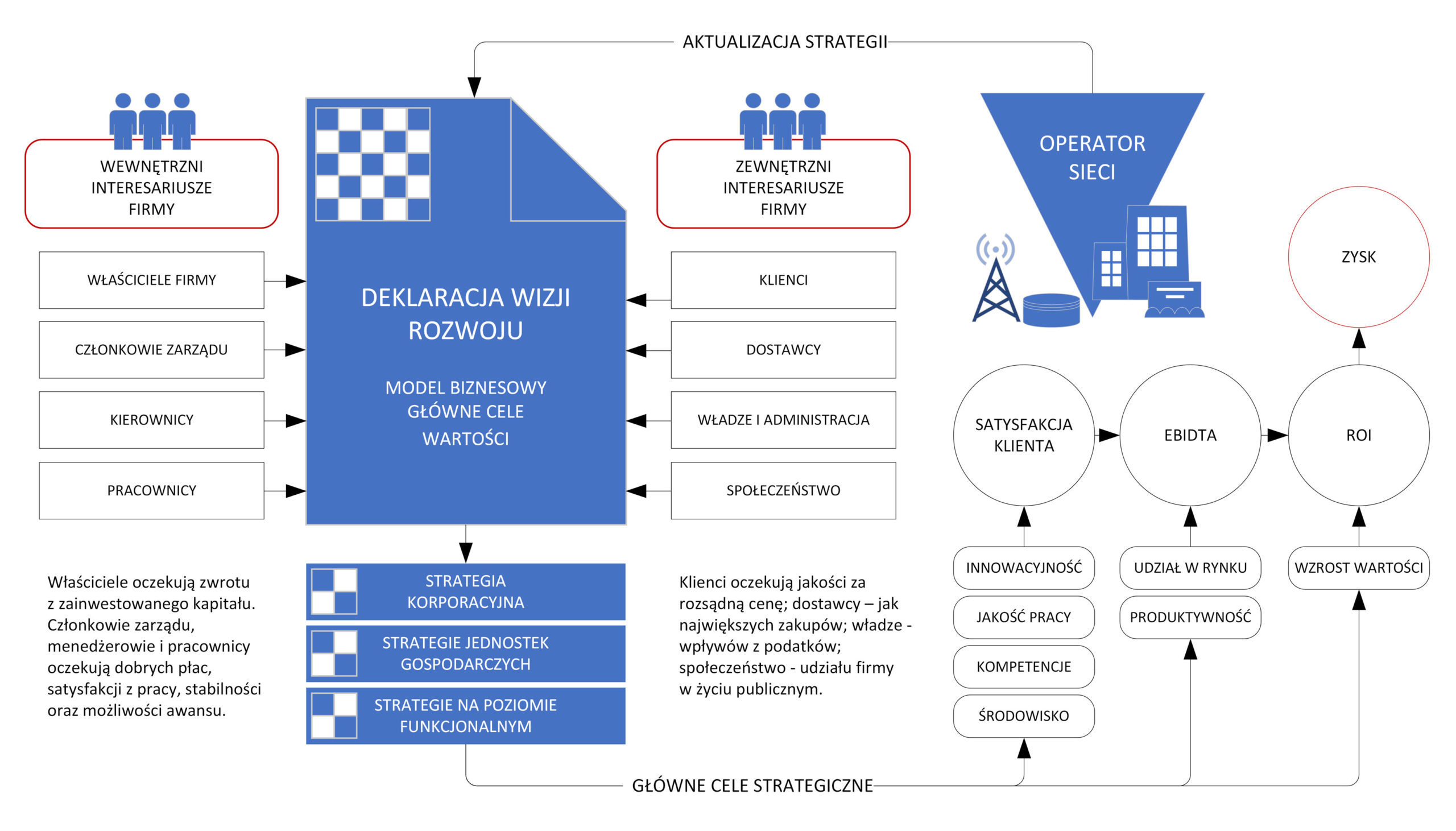 Punktem wyjścia w planowaniu strategicznym jest uświadomienie sobie, że istotą działalności firmy jest zaspokajanie potrzeb jej klientów oraz innych interesariuszy, a nie pieniądze. Przychody ze sprzedaży i zysk są tylko pochodną właściwego rozpoznania oraz zaspokojenia rynkowych potrzeb, a także oczekiwań pracowników, dostawców technologii czy władz wydających koncesje na użytkowanie radiowych częstotliwości. Oczywiście, grup interesariuszy można wymienić więcej. Dobre rozpoznanie konkurencyjnego otoczenia firmy jest podstawą formułowania realistycznej wizji rozwoju, a następnie ustalania strategii korporacyjnej, strategii poszczególnych jednostek gospodarczych oraz strategii na poziomie funkcjonalnym firmy.