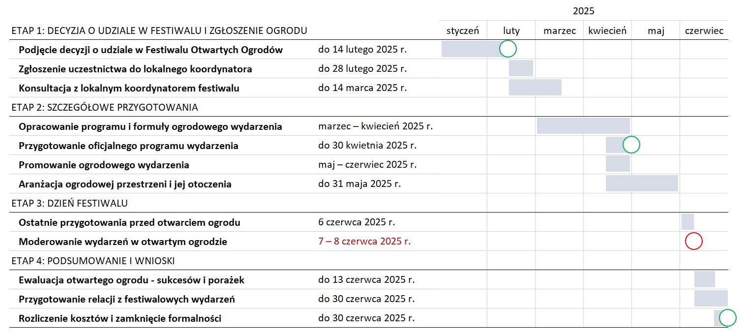 Projekt Festiwalu Otwarte Ogrody, jak każdy inny projekt, charakteryzują trzy główne wymiary: zakres prac, czas oraz zasoby – organizacyjne, finansowe, rzeczowe i ludzkie – niezbędne do ich wykonania. Jednym z podstawowych zadań lokalnego koordynatora jest odpowiednio wczesne przygotowanie szczegółowego planu działań oraz harmonogramu ich wykonania. Plan ten powinien uwzględniać wszystkie etapy przygotowań – od pierwszych spotkań organizacyjnych, przez promocję wydarzeń, aż po działania logistyczne i rozliczeniowe. Powinien być rozpisany na poszczególnych współpracowników, partnerów oraz wolontariuszy. Pomocnym narzędziem w przygotowaniach do festiwalu są również listy kontrolne, które ułatwiają bieżące śledzenie postępów, przypominają o zadaniach do wykonania i pozwalają lepiej koordynować pracę zespołu. Dzięki takiemu uporządkowaniu organizacja festiwalu przebiega sprawnie i przejrzyście, oferując wszystkim zaangażowanym poczucie klarownej struktury zadań oraz jasną wizję celów podejmowanych wysiłków.
